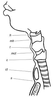 Более высокие звукиобразуются, когда голосовые складки утончаются, а их натяжение увеличивается (аналогия со струной). Эти изменения голосовых складок наступают в результате сокращения передней щитоперстневидной мышцы,что уменьшает расстояние между щитовидным и перстневидным хрящами спереди и увеличивает расстояние между щитовидным и черпаловидными хрящами сзади. Указанные взаимоотношения трех хрящей обусловливают задаваемые функцией вокального слухачастоту колебания голосовых складок. Можно предполагать, что этот механизм настройки голосовых складок используется для образования звуков второй четверти индивидуального голосового диапазона.