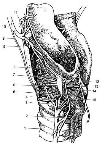 1– возвратный нерв; 2– нижний сегмент петли Галена[3]; 3, 6– волокна к щиточерпаловидной мышце; 4– латеральная перстнечерпаловидная мышца; 5– петля Галена; 7– черпаловидный хрящ; 8– продолжение верхнего гортанного нерва; 9– наружная ветвь верхнего гортанного нерва; 10– ствол верхнего гортанного нерва; 11– нервные волокна к надгортаннику; 12, 13– косые и поперечные волокна черпало-черпаловидной мышцы; 14– нервные волокна к черпало-черпаловидной мышце; 15– задняя перстнечерпаловидная мышца