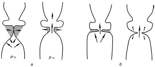 Рис. 18.7.Форма и направление колебаний голосовых складок при фонации низкого (а) и высокого (б) звуков. Слева – максимальное сближение голосовых складок; справа – максимальное расхождение голосовых складок; большие стрелки указывают вектор силы барометрического давления и направление движения воздуха; маленькие – направление колебания голосовых складок. Р >, P< – соответственно повышение и понижение давления в подскладочном пространстве