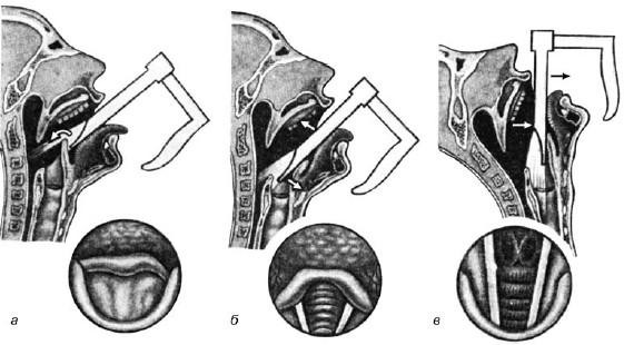 Передняя поверхность надгортанника посредством широкой связки (см. цветную вклейку, рис. 3, а, 1)соединена с телом и рогами подъязычной кости. Кпереди от надгортанника на корне языка находятся ямки (vallecu^^ разделенные уздечкой (frenulum). От боковых краев надгортанника к черпаловидным хрящам протягиваются черпалонадгортанные складки. У детей и у некоторых взрослых надгортанник выглядит в виде полусвернутого листка, прикрывающего вход в гортань. Такой надгортанник служит существенным препятствием при осмотре гортани методом непрямой ларингоскопии.