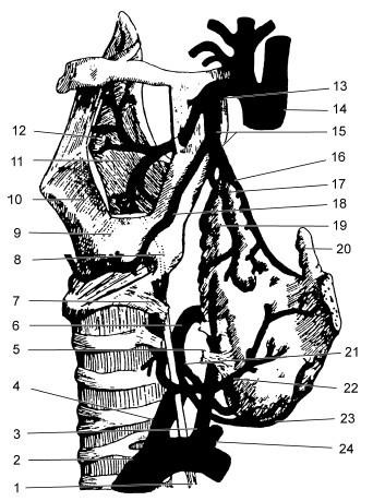 II– преддверие гортани (вскрыто); 12– надгортанные ветви верхней гортанной артерии; 13– верхняя щитовидная артерия; 14– бифуркация общей сонной артерии; 15– верхняя щитовидная артерия; 16, 17– конечные ветви верхней щитовидной артерии; 18– нижняя гортанная артерия; 19– пирамидальная доля щитовидной железы; 20 –пирамида Лалуетта; 21–23– ветви нижней щитовидной артерии; 24– шейно-лопаточная артерия
