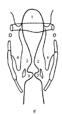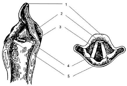 Надгортанник(см. цветную вклейку, рис. 2, а, 4)состоит из эластического хряща и напоминает листок с ровными краями, сужающийся книзу в виде стебелька (petiolus), который входит в верхнюю вырезку щитовидного хряща и прикрепляется с внутренней стороны к пластинам этого хряща, образуя бугорок надгортанника(б, 1). Задняя поверхность надгортанника покрыта многочисленными ямками, в которых размещаются гроздевидные слизистые железы. В этих железах нередко развивается воспаление, заканчивающееся абсцессом надгортанника. Внутреннее строение гортани представлено на рис. 3 (см. цветную вклейку).