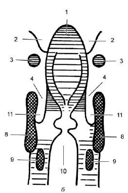 Щитовидный хрящрасположен на перстневидном. Его пластинки, соединяющиеся впереди под углом, защищают внутренние структуры гортани от внешних механических воздействий. У верхнего края угла щитовидного хряща имеется верхняя вырезка (а, 10),которая легко прощупывается сразу же над кадыком – выступом, образованным соединением пластинок щитовидного хряща.
