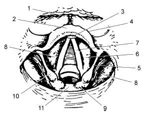 I– возвратный нерв; 2– подключичная артерия; 3– нижняя щитовидная артерия; 4– позвоночная артерия; 5– щитовидно-трахеальная связка; 6– задняя гортанная артерия; 7– щитоперстневидная связка; 8– анастомоз между задней и верхней гортанными артериями; 9– анастомоз между верхней и нижней гортанными артериями; 10– щитовидный хрящ;