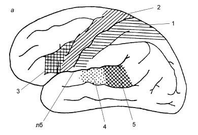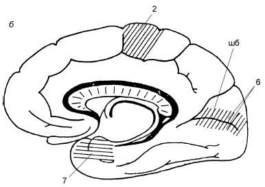 а– верхнелатеральная поверхность левого полушария; б– медиальная поверхность правого полушария; 1– ядро кожного анализатора (тактильная, болевая, температурная чувствительность); 2– ядро двигательного анализатора; расположено в предцентральной извилине и в верхней теменной дольке; 3– речедвигательный анализатор; расположен в задней части нижней лобной извилины (двигательный центр речи Брока, односторонний – у правшей в левом полушарии, у левшей – в правом); 4– ядро звукового анализатора; расположено в задней части верхней височной извилины на поверхности, обращенной к островку – поперечные височные извилины; 5– ядро звукового анализатора устной речи; расположено в задней части верхней височной извилины, в глубине латеральной борозды (лб) – центр речи Вернике; 6– ядро зрительного анализатора; расположено по краям шпорной борозды (шб); 7– ядро обонятельного и вкусового анализаторов; расположено в крючке