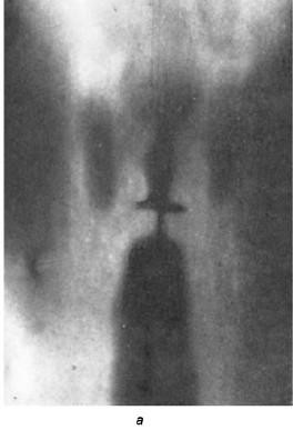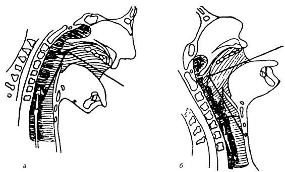 Методом специальной кинофотосъемки, а позже и с помощью телевизионной стробоскопии, установлено, что при образовании низких и средних звуков голосовые складки имеют вид двух толстых напряженных мышечных валиков, плотно прижатых друг к другу (рис. 18.7, а), а раскрытие голосовой щели происходит лишь на очень короткий период, в течение которого через голосовую щель происходит сильный прорыв воздуха. При этом колебания голосовых складок совершаются перпендикулярно продольной оси гортани. Такой способ голосообразования обеспечивает появление звука, богатого обертонами и отличающегося полнотой и глубиной звучания.