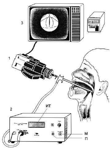 1– видеокамера с жестким эндоскопом; 2– программный электронный стробоскопический блок управления; 3– видеомонитор; М – гнездо для подключения микрофона; П – гнездо для подключения педали управления стробоскопом; ИТ – индикаторное табло