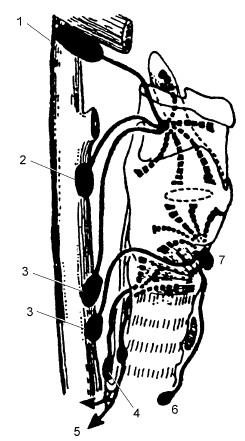 1 , 2, 3– верхние, средние и нижние яремные лимфатические узлы; 4– лимфатические узлы, сопровождающие возвратный нерв; 5– направления к лимфатическим узлам средостения; 6– претрахеальные лимфатические узлы; 7– предгортанные лимфатические узлы