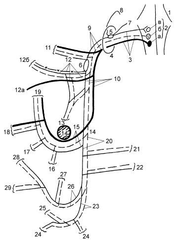 От наружной сонной артерии отходит полнокровная артерия с большим систолическим давлением в ней – верхняя щитовидная артерия(рис. 18.1, 13) (a. thyrolaryngea superior), от которой берут начало верхняя гортанная (18)и верхняя щитовидная (15) артерии.От верхней щитовидно-гортанной артерии или непосредственно от верхней гортанной артерииотходит ствол, направляющийся к надгортаннику, в котором он делится на надгортанные ветви(12). Артерия, питающая надгортанник, отходит от верхней гортанной артерии после отделения от нее верхней щитовидной артерии.