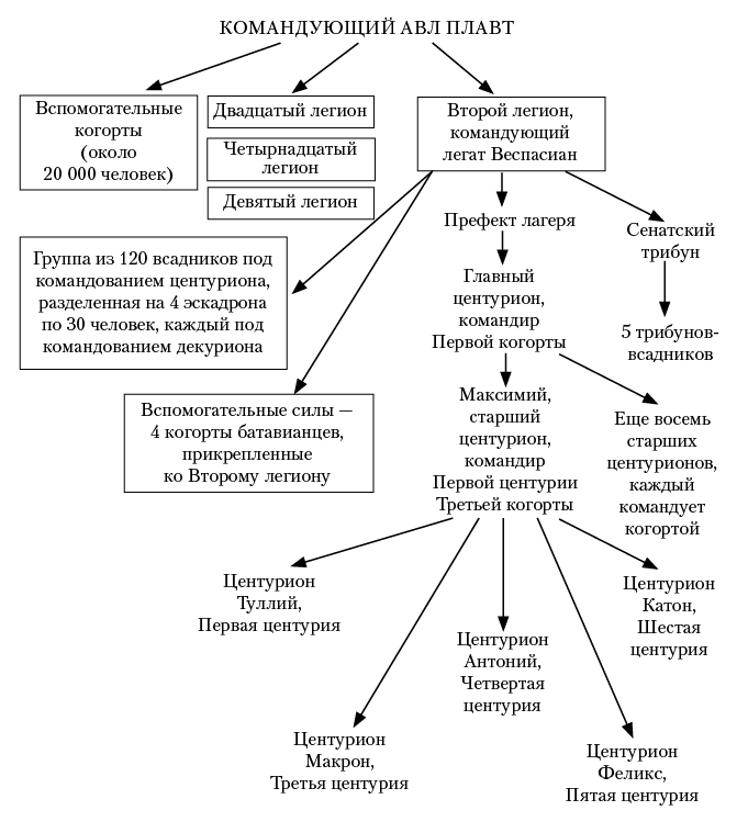 Второй легион, «родной дом» Макрона и Катона, как и все легионы, состоял примерно из пяти с половиной тысяч солдат. Основным его структурным подразделением была центурия из восьмидесяти человек под командованием ЦЕНТУРИОНА, чей помощник или заместитель именовался ОПТИОНОМ. Центурия состояла из десяти отделений по восемь человек, которые квартировали вместе в казармах или в палатке, если находились в походе. Шесть центурий составляли когорту, а десять когорт — легион, причем в первую когорту входило вдвое большее число солдат. Кроме того, к легиону прикреплялось кавалерийское подразделение из ста двадцати человек, разделенное на четыре эскадрона. Конные воины в основном исполняли обязанности разведчиков и гонцов. В личный состав легиона входили следующие чины, в порядке понижения.