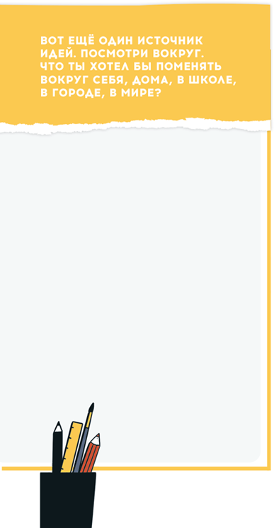 Проблемы могут быть очень разными: от сложностей с домашкой до загрязнения воздуха на Земле. Подумай, поищи, поспрашивай людей. Обрати внимание на Цели устойчивого развития, которые сформулировала Организация Объединённых Наций. Это 17 целей по борьбе с главными проблемами человечества. Может быть, они подскажут направление мысли.