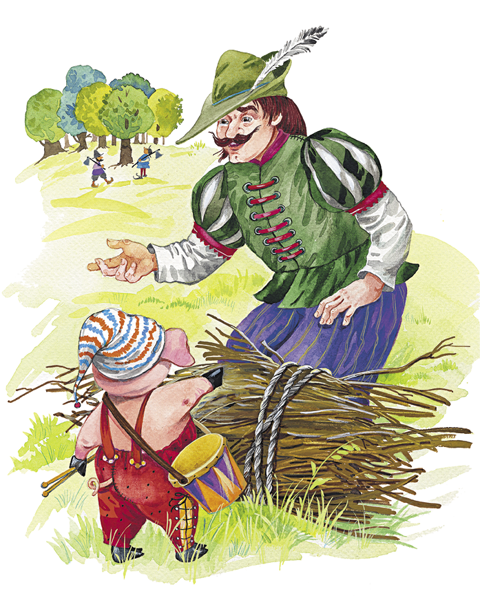 Младший братец пошёл вдоль поля и встретил скоро крестьянина, который нёс домой большущую охапку соломы. Очень тяжело крестьянину было. Вот и говорит ему поросёнок: