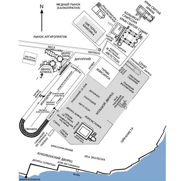 Главная Золотая Орда — «Золотая палата» (Хрисотриклион). Священный дворец императоров в придворном уставе — здания, которые прилегали или вели к Золотой палате и входили в комплекс царских жилищ. Размещался он с северной стороны города, где начиналась стена Ираклия, примыкал к Ипподрому, имел выход к морю. Во дворце находился учрежденный Львом Философом маяк, который при помощи особой системы огней сообщал новости по всей империи.