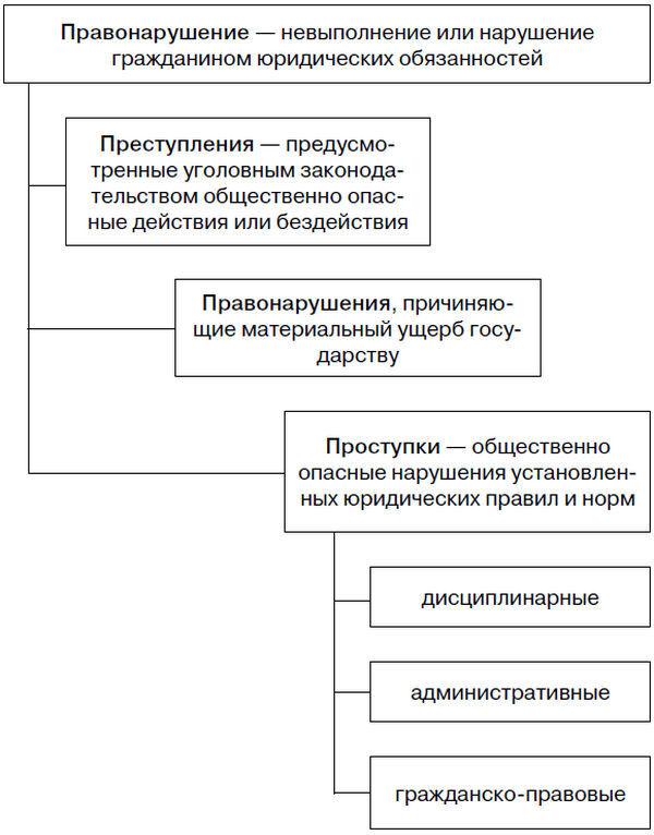 Для нормальной жизни человека в обществе важным и необходимым является соблюдение законности, дисциплины и правопорядка во всех без исключения сферах и областях. Это особенно актуально для воинской деятельности, поэтому каждый военнослужащий несёт персональную юридическую ответственность за свои противоправные действия – правонарушения. Структура основных видов правонарушений приведена на схеме 2.