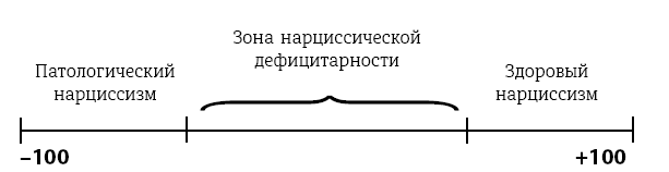 Представьте себе горизонтальную шкалу с делениями от –100 до +100. В крайней правой точке будет находиться тот самый здоровый нарциссизм как состояние нарциссической нормы и полноты. Я допускаю, что такие люди есть. И что у них на самом деле все в порядке с самооценкой, самоуважением и ощущением себя. Повторяю: «на самом деле». Потому что компенсирующего собственную неполноценность и чисто внешнего предъявления «со мной все в порядке» вокруг нас навалом.