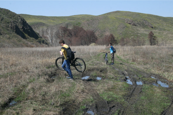 По горному распадку мы уже спустились в ущелье. Здесь было совсем сыро. Аулган в половодье разливается широко. Сейчас вода сошла. Но под ногами хлюпало. На колеса велосипедов намотало всякой всячины, принесённой весенней водой. И мы еле тащили свою технику через эту контрольно-грязевую полосу. С прибрежных ив свисали пучки трав. Ил сцементировал сухие, изломанные стебли в причудливые комья. А тени от нависающих скал придавали получившимся взъерошенным фигурам совсем зловещий вид.