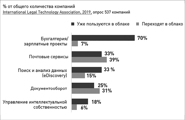 Развитие возможностей облачных сервисов несомненно приведет к росту числа юридических организаций, использующих их в различных видах своей деятельности19 (рис. 2).