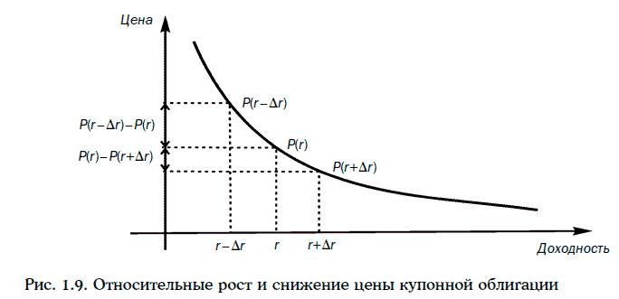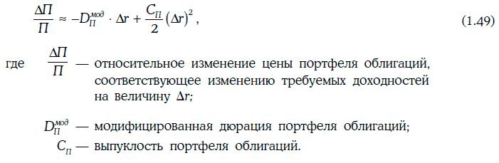 На основе равенства (1.49) можно сделать следующий вывод о роли выпуклости портфеля облигаций как меры процентного риска: если портфели облигаций имеют одну и ту же модифицированную дюрацию, то у портфеля с большей выпуклостью относительный рост цены больше, а относительное снижение цены — меньше.