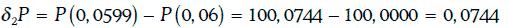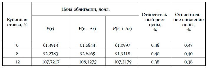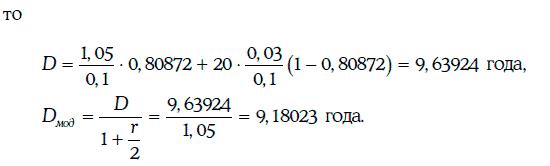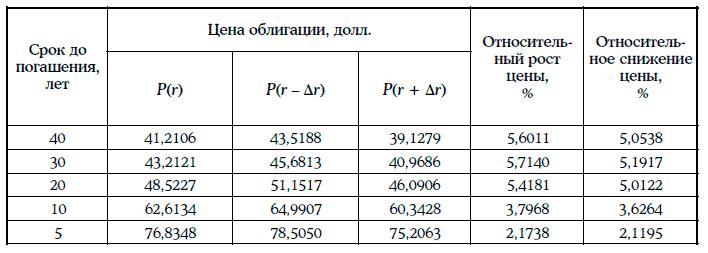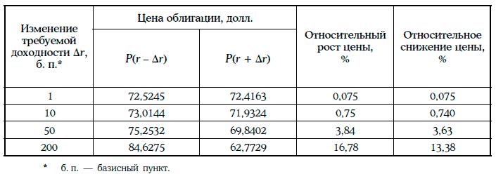 Заметим, что относительное изменение цены финансового инструмента, найденное приближенно, без учета выпуклости, равно -0,01026, а точное значение этого изменения равно -0,010189.