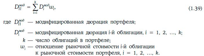Модифицированной дюрацией портфеля облигаций называют взвешенную по стоимости сумму модифицированных дюраций облигаций, входящих в этот портфель, т.е.
