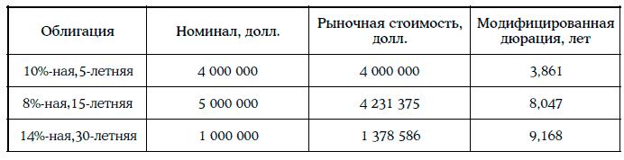 Если же инвестор взял облигацию взаймы у дилера и продал ее на рынке, то говорят, что на рынке облигаций он занимает короткую позицию (short position). Инвестор, занимающий короткую позицию, обязан в определенный момент времени в будущем вернуть облигацию дилеру и выплатить компенсацию за недополученные купонные платежи. Рассмотрим на примере, как определить модифицированную дюрацию портфеля, состоящего из длинных и коротких позиций на рынке облигаций.