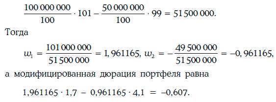 Пример 1.38. Портфель состоит из двух позиций: длинной позиции в размере 100 млн долл. по двухлетней облигации ценой 101 долл. с модифицированной дюрацией 1,7 и короткой позиции в размере 50 млн долл. по 5-летней облигации ценой 99 долл. с модифицированной дюрацией 4,1. Определим модифицированную дюрацию этого портфеля.
