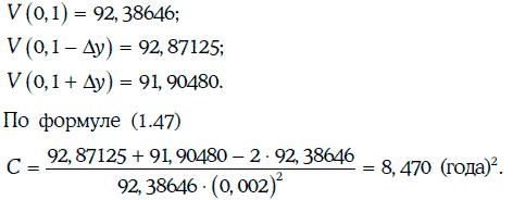 Оценим выпуклость данной облигации с помощью приближенной формулы (1.47), считая, что номинал облигации равен 100 долл. Изменение требуемой доходности выберем в 20 базисных пунктов (Δу = 0,002). Тогда