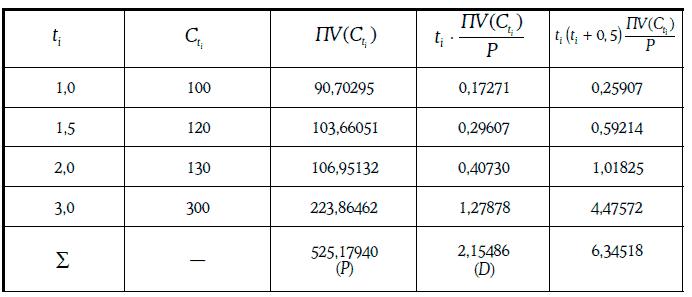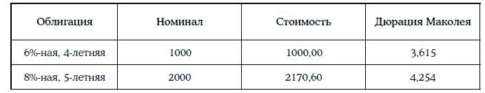 Пример 1.40. Рассмотрим портфель из двух облигаций с полугодовыми купонами, когда все рыночные доходности равны 6%. Основные данные об облигациях портфеля приведены ниже в таблице: