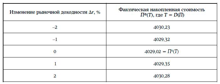 В таблице указаны фактические накопленные стоимости через 4,053 года при различных изменениях рыночных доходностей: