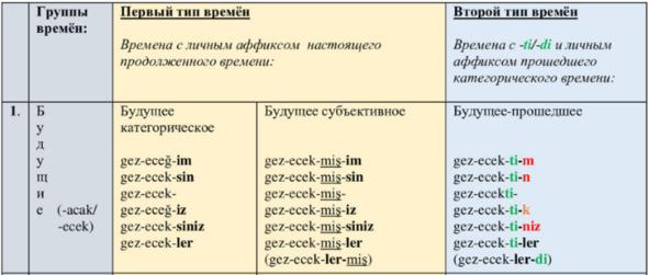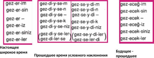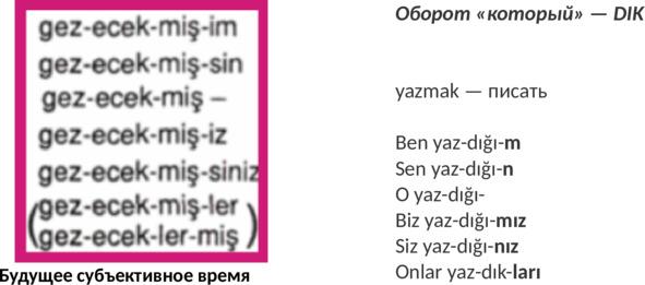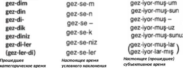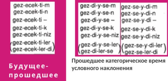 Sanmak.. (настоящее широкое вр.) (я думаю) başarılı bir suçlu olabilmak.. (прошедшее категорическое вр. условного накл.) (если бы он мог быть успешным преступником) daha iyi hissetmek.. (будущее-прошедшее вр.) (он чувствовал бы себя лучше).