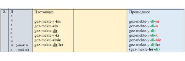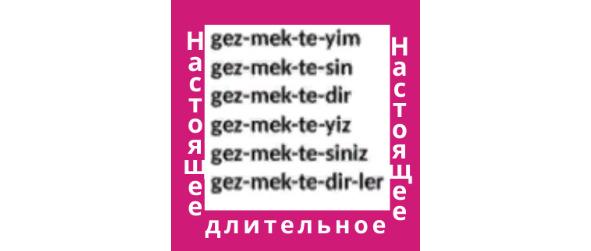 Настоящее продолженное время является аналогом турецкого настоящего длительного времени (-makta/-mekte), однако настоящее продолженное время гораздо более употребительное. Передает действия, которым говорящий лично был свидетелем.