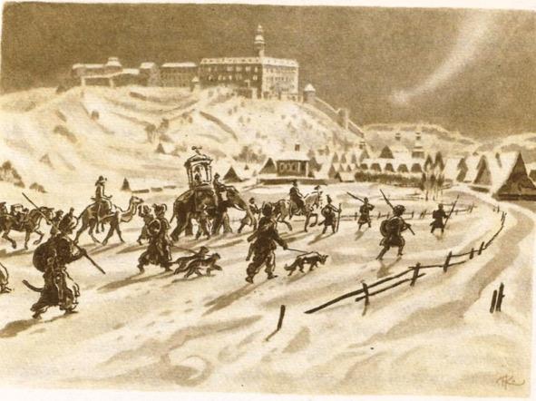 В избе учителя пана Подгайского было тепло и уютно. За окнами, на которых трескучий мороз нарисовал диковинные цветы, зеленел свежий мох, украшенный красной рябиной и алыми бумажными розочками. В центре между окнами вился снизу по белой стене до самого зеркала тёмно-зелёный буйный плющ, а поодаль слева от двери висел Рождественский вертеп, который учитель только сегодня ранним утром обновил. Вертеп украшала золотая звезда с длинным шлейфом до самого пола, поросшего мхом, указывая путь к яслям, навстречу к бумажным, ярко раскрашенным волхвам-королям в пёстрых одеждах, несущих нарисованные драгоценные дары. Белый король, жертвующий золото, стоял у самых яслей, в аккурат рядом с «чернобородым», а за ним — вся его свиста с белой лошадью, горбатым верблюдом и слоном в яркой попоне с карманами, стянутой золочёным ремешком.