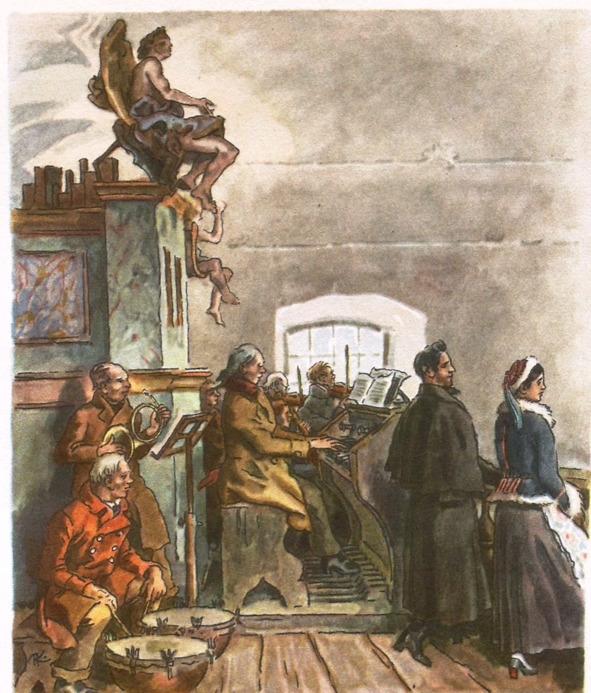 Регент играл как никогда. Чувствовал, какая сегодня месса, преимущественно из-за посланного музыканта. Ведь родственник Франтишка Бенды! Всё в мире перед этим меркло. Вон он, на возвышении, справа от рояля, а слева о него хор и музыканты. Прямо как генерал перед битвой. Лицо его приняло серьёзный вид, даже строгий, а горящий взор просветлял весь облик. Потом кивнул головой — раз, два, три! — и скрипки заиграли в унисон.