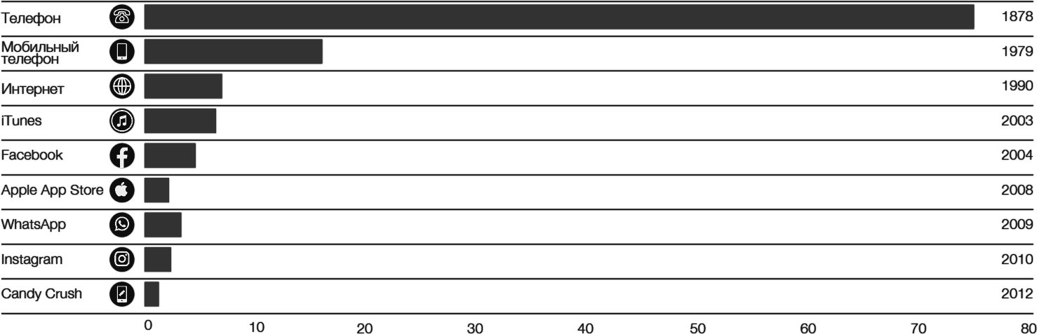 Рисунок 3. Время, потребовавшееся технологиям и приложениям для приобретения 100 млн пользователей