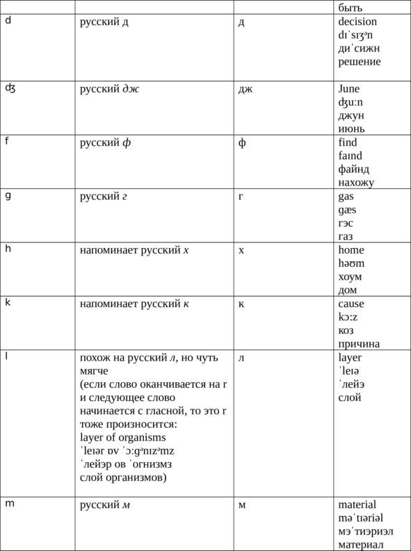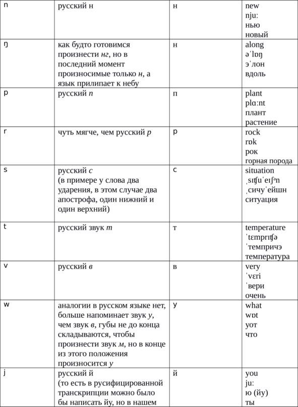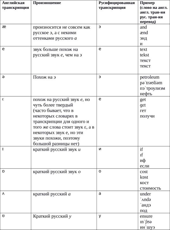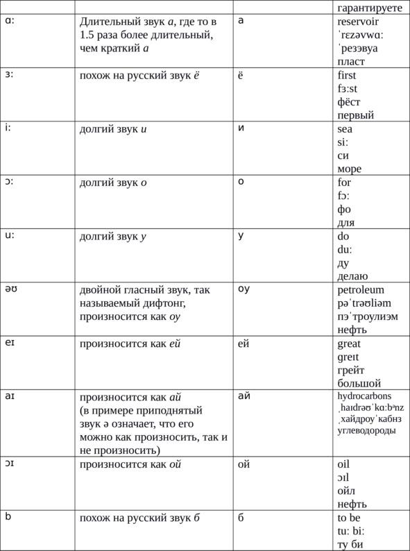 В английском языке бывают двойные гласные звуки дифтонги, которые в некоторых случаях произносятся не так, как отдельные гласные, их составляющие. Такие нестандартно произносимые дифтонги приведены в нижеследующей таблице, объясняющей произношение английских звуков. В этой таблице также приведена русифицированная транскрипция и даны примеры использования транскрипции в четвертом столбце — именно так будет и в тексте данной книги, посвященном нефтегазовой отрасли. Сначала будет английский абзац, затем английская транскрипция, потом русифицированная транскрипция и перевод на русский язык.