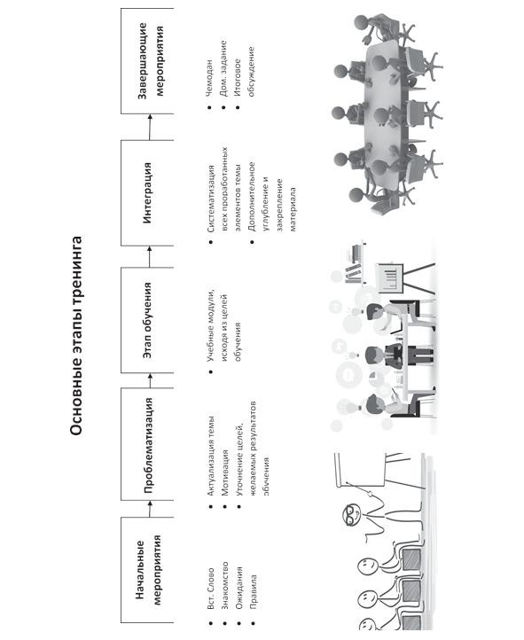 На предыдущей странице расположена структура, включающая основные этапы обучающих тренингов. Именно эта структура лежит в основе технологии проведения тренинга, которая излагается в данной книге, и является ее ключевым элементом. Она универсальна и позволяет разрабатывать и проводить любые обучающие тренинги.