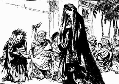 So, rising at dawn of day, he buckled on his armour, laced his helmet, and with the falchion Ascalon in his hand, bestrode Bayard, and rode into the Valley of the Dragon. Now on the way he met a procession of old women weeping and wailing, and in their midst the most beauteous damsel he had ever seen. Moved by compassion he dismounted, and bowing low before the lady entreated her to return to her father's palace, since he was about to kill the dreaded dragon. Whereupon the beautiful Sâbia, thanking him with smiles and tears, did as he requested, and he, re-mounting, rode on his emprise.