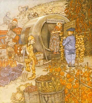 So nothing was left save to go back to her stepmother in fear and trembling. But, for a wonder, her stepmother did not seem very angry. She only scolded her for being so late, for, see you, her father and her little playmate had gone to their beds and were in the Land of Nod.
