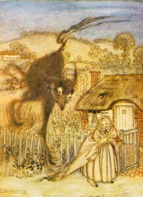 So the little girl took the money and set off quickly through the snow, for already it was growing dark. Now there was such a wind blowing that it nearly blew her off her feet, and as she ran her beautiful hair got all tangled and almost tripped her up. However, she got the candles, paid for them, and started home again. But this time the wind was behind her and blew all her beautiful golden hair in front of her like a cloud, so that she could not see her steps, and, coming to a stile, had to stop and put down the bundle of candles in order to see how to get over it. And when she was climbing it a big black dog came by and ran off with the bunch of candles! Now she was so afraid of her stepmother that she durst not go home, but turned back and bought another bunch of candles at the grocer's, and when she arrived at the stile once more, the same thing happened. A big black dog came down the road and ran away with the bunch of candles. So yet once again she journeyed back to the grocer's through wind and snow, and, with her last penny, bought yet another bunch of candles. To no purpose, for alas, and alack-a-day! when she laid them down in order to part her beautiful golden hair and to see how to get over the stile, a big black dog ran away with them.