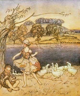And the goldsmith gave the bauble willingly, and the bird sang its song once more. Then with the rose-red shoes in one foot and the golden chain in the other, the bird flew to an oak tree which overhung the mill stream, beside which three millers were busy picking out a millstone, and, perching on a bough, sang its song ever so sweetly: