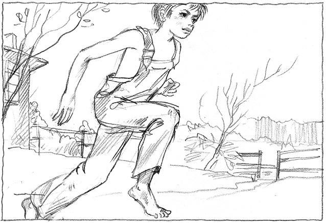 «Ба-рум, ба-рум, ба-рум, ба-ри-пи-ти, ба-ри-пи-ти, ба-ри-пи-ти». Так. Отец заводит пикап. Вот уже вроде уехал. Теперь можно вставать. Джесс выскользнул из постели прямо в комбинезон. Рубашку он презрел — едва начав бегать, он распарится, как шкварки на сковородке, даже если утро будет прохладным; презрел и обувь, потому что подошвы ног стали твердые, как ношеные кеды.