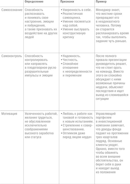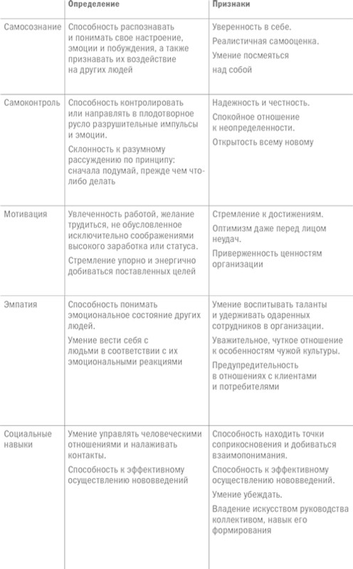 Весь прошлый год мы вместе с коллегами на примере различных организаций тщательно изучали механизмы, лежащие в основе эмоционального интеллекта. Мы анализировали связь эмоционального интеллекта с высокой эффективностью деятельности, особенно на высших уровнях управления; наблюдали, как эмоциональный интеллект проявляется в сфере трудовых отношений. Например: как определить, обладает ли кто-то развитым эмоциональным интеллектом? Как распознать это качество в самом себе? Ниже мы даем ответы на эти и другие вопросы, поочередно рассматривая каждую составляющую эмоционального интеллекта: самосознание, самоконтроль, мотивацию, способность к сопереживанию и социальные навыки.