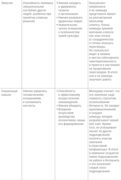 Первые три составляющие эмоционального интеллекта относятся к умению человека управлять собой. Последние две — способность сопереживать и социальные навыки — связаны с искусством управлять отношениями с другими людьми. Такой компонент эмоционального интеллекта, как социальные навыки, не совсем прост, как может показаться на первый взгляд. Их нельзя отождествлять с обычным дружелюбием, хотя люди, владеющие социальными навыками, редко бывают злыми. Правильнее было бы сказать, что социальные навыки — это дружелюбное отношение к людям, будь то новая маркетинговая стратегия или разработка очередного продукта. Люди, обладающие социальными навыками, обычно имеют обширный круг знакомств и умеют легко находить контакт с различными людьми. Это не означает, что они непрерывно общаются; просто они уверены, что в одиночку нельзя сделать ничего важного. Такие люди имеют нужные связи и используют их, когда наступает время действовать.