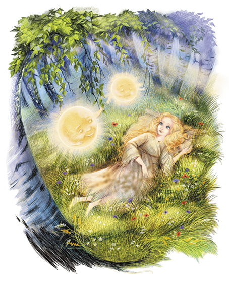 И тотчас громче зазвучали звуки далёкой тонкой флейты, кузнечики в траве застрекотали веселее, а птицы на ветках, распевавшие каждая свою песенку, запели дружно все вместе.