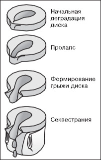 Во время второго этапа остеохондроза повреждается позвоночный диск и ядро хряща «выпадает» (рис. 1.6), образуются грыжи межпозвоночных дисков, сдавливаются нервные корешки, появляются боли в спине и в других органах (например, в сердце или печени).