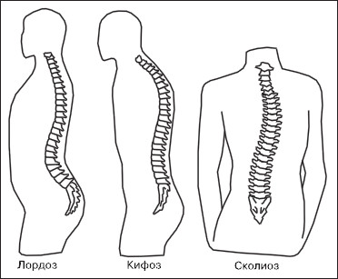 Натретьей стадии заболевания, к сожалению, приходится говорить уже о фиксированных изменениях позвоночника: кифозе, лордозе и сколиозе (рис. 1.5). Кифоз характеризуется выпуклостью позвоночника сзади, то есть формируется горб. При лордозе, наоборот, искривление позвоночника образуется выпуклостью вперед. Под сколиозом понимают боковые искривления позвоночника.