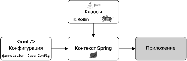 Итак, что же нужно для запуска приложения Spring? Spring работает с простыми Java-объектами в старом стиле (Plain Old Java Objects, POJOs), что сильно упрощает расширение. Spring обеспечивает готовность приложений к промышленной эксплуатации; впрочем, ему нужно немного помочь, добавив конфигурацию, связывающую воедино все зависимости и внедряющую зависимости, необходимые для создания компонентов Spring и выполнения приложения (рис. 1.1).