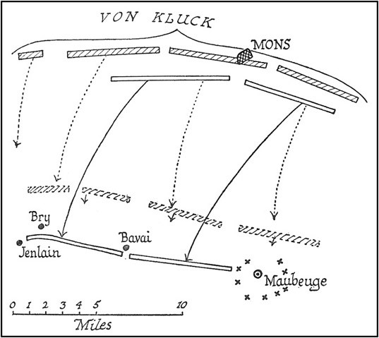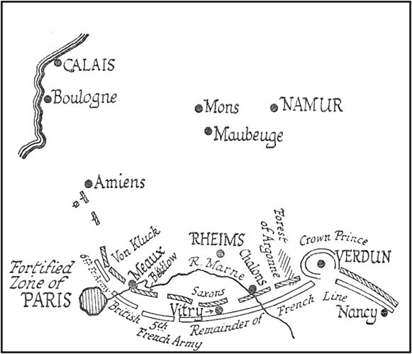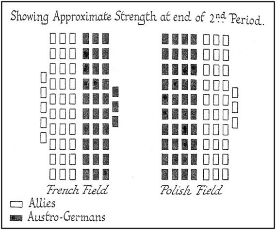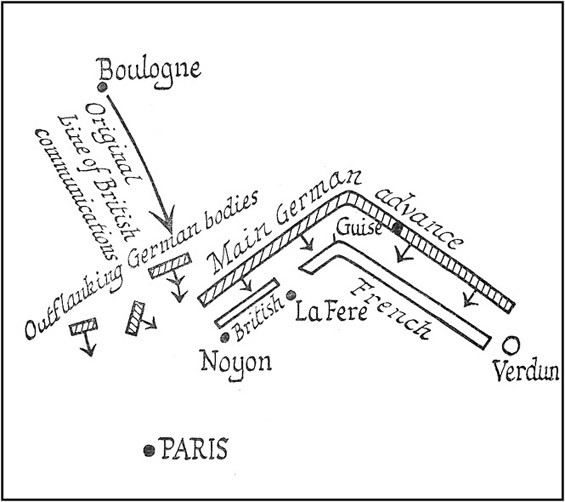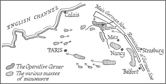 It is even possible, where the writer has seen the ground over which the battles have been fought (and much of it is familiar to the author of this), so to describe such ground to the reader that he will in some sort be able to see for himself the air and the view in which the things were done: thus more than through any other method will the things be made real to him. The aim, therefore, of these pages, and of those that will succeed them, is to give such a general idea of the campaigns as a whole as will permit whoever has grasped it a secure comprehension of the forces at work, and of the results of those forces. It is desired, for example, that the reader of these pages shall be able to say to himself: "The Germanic body expected to win—and no wonder, for it had such and such advantages in number and in equipment.... The first two battles before Warsaw failed, and I can see why. It was because the difficulties in Russian supply were met by a contraction of the Russian line.... The 1st German Army was compelled to retreat before Paris, and I can now see why that was so: as it turned to envelop the Allied line, a great reserve within the fortified zone of Paris threatened it, and forced it back."