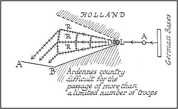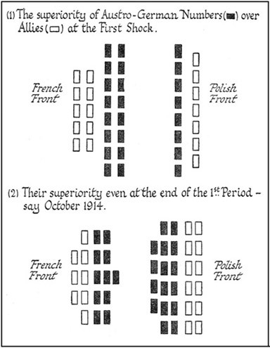 In Part III, I will very briefly describe the original armed dispositions for combat at the outbreak of war, the German aim upon the West, and the German orders to the Austrians upon the East; the overrunning of Belgium, and the German success upon the Sambre; then the pursuit of the Franco-British forces to the line Paris-Verdun, up to the eve of the successful counter-offensive undertaken by them in the first week of September. I will end by describing what were the contemporary events in the Eastern field: in its northern part the overrunning of East Prussia by the Russians, and the heavy blow which the Germans there administered to the invader; in its southern the Austrian opposition to the Russians on the Galician borders, and the breakdown of that opposition at Lemberg.