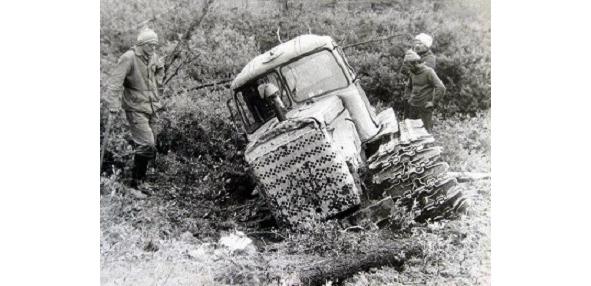 И еще запомнился эпизод, как мы выплываем из-за поворота, а на склоне стоят Камазы. Они были оставлены до зимы, застигнутые, видимо, ранней весной. Ниже в воде стоял тяжелый гусеничный трактор — видимо тащил груз (балок или сани), просел под лед и вытащить его не смогли. И тут пленка у Гены кончилась…